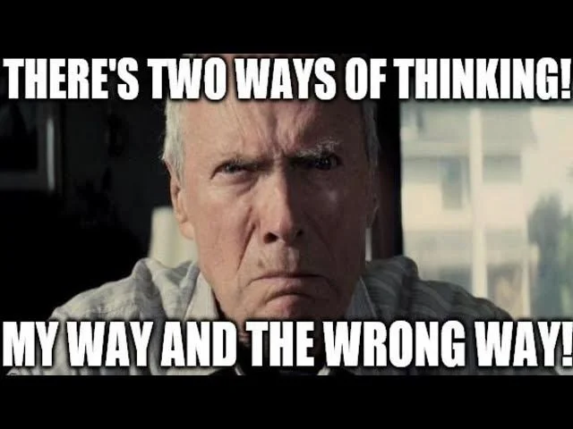 Image: grumpy Clint Eastwood with the text “There’s two ways of thinking! My way and the wrong way!”