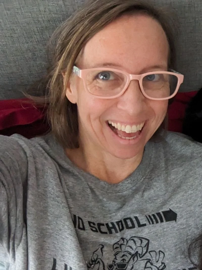 Image: a selfie of me on my birthday morning - in my pajama shirt and pink dollar store reading classes (gotta keep a pair by the bed) making a goofy smile